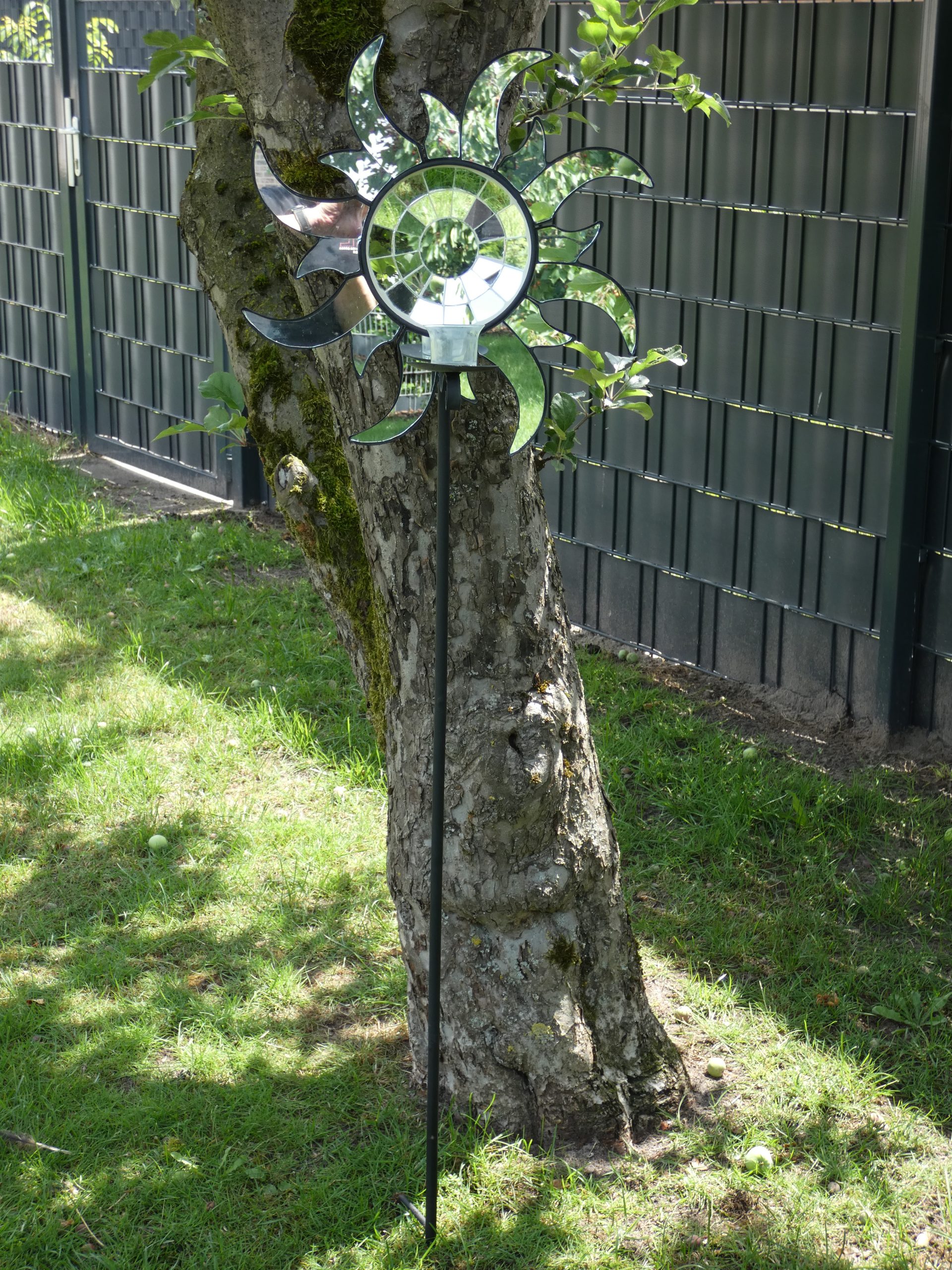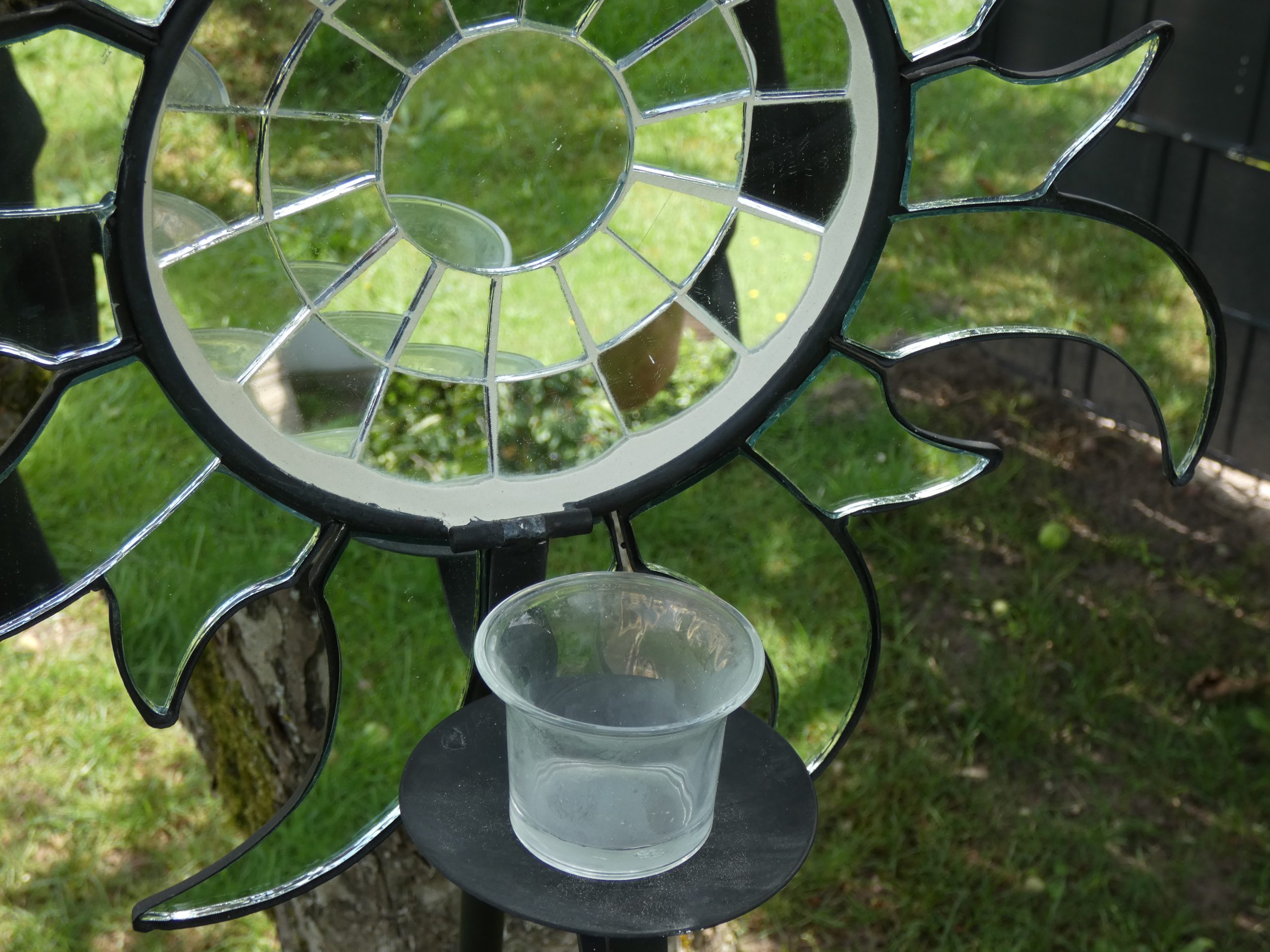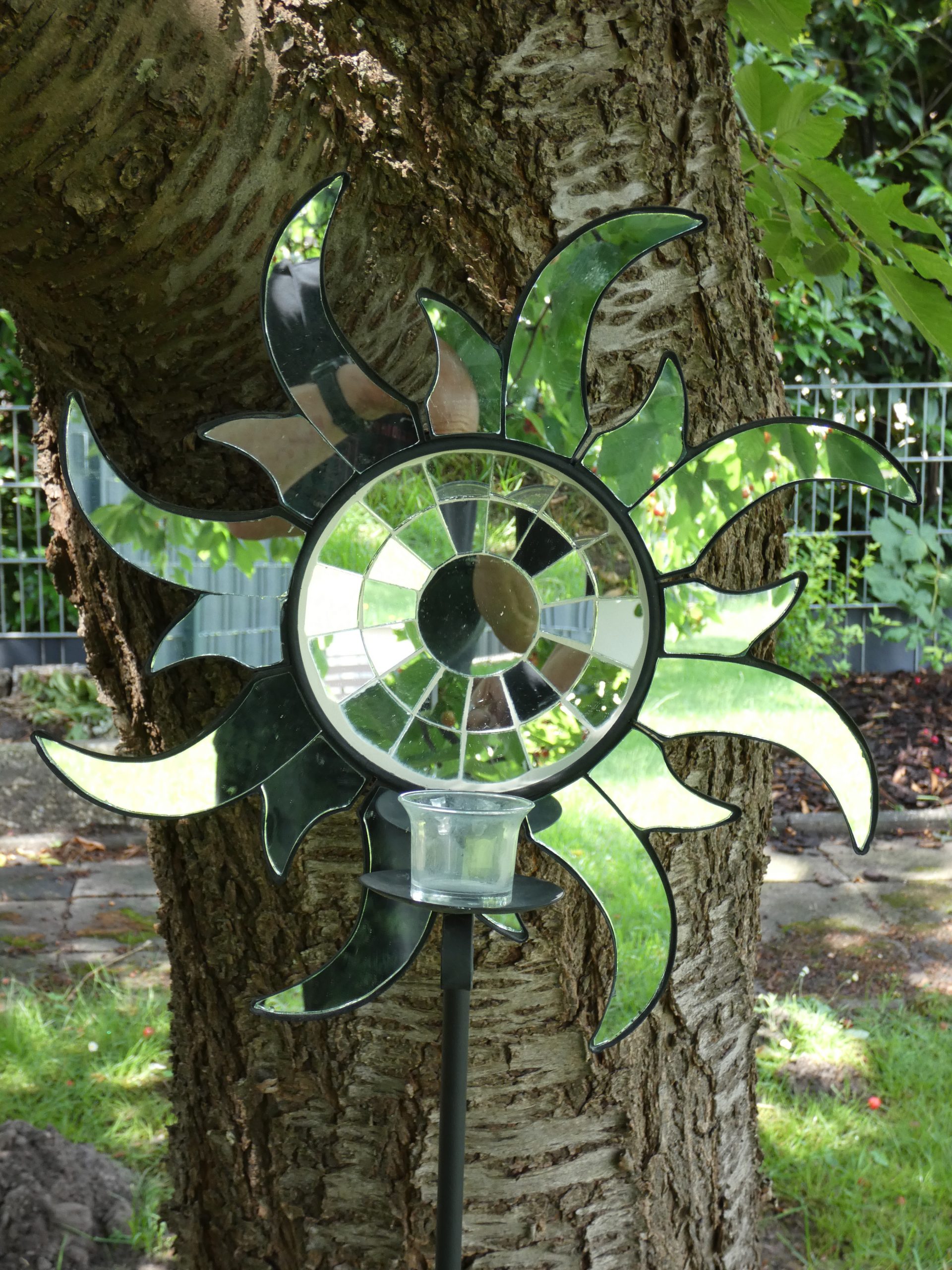Es handelt sich um eine Sonne mit Mosaik Spiegelglas & Kerzenhalter.